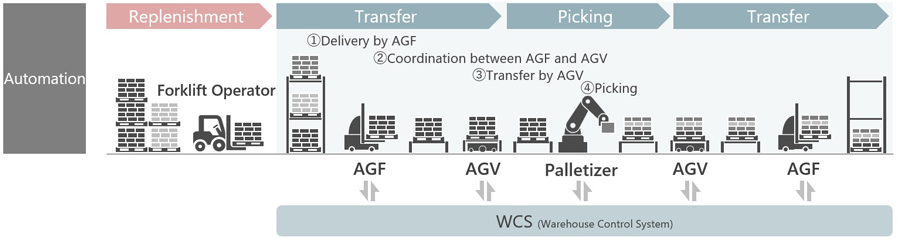 ●AGF、AGV 和碼垛機通過使用 MHI 的集成倉庫控制系統(tǒng)進行有效協(xié)調。采用優(yōu)化的邏輯,使用最少的碼垛操作來響應客戶的需求。
