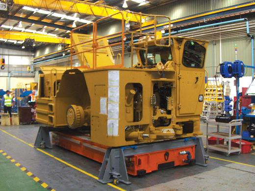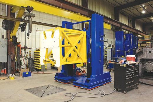 圖 2:在此圖中,兩個(gè)物料搬運(yùn)選項(xiàng)協(xié)同工作:內(nèi)置氣動(dòng)起落架系統(tǒng)將發(fā)動(dòng)機(jī)重建定位裝置移動(dòng)到起重機(jī)下方