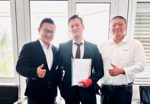對(duì)總部位于德國不來梅附近斯圖爾的 Mushiny Robotics Europe GmbH 的成立感到高興(左起):聯(lián)合創(chuàng)始人 Thomas Li、公證人 Wolf Schr?der 和董事總經(jīng)理 Ming Liu。
