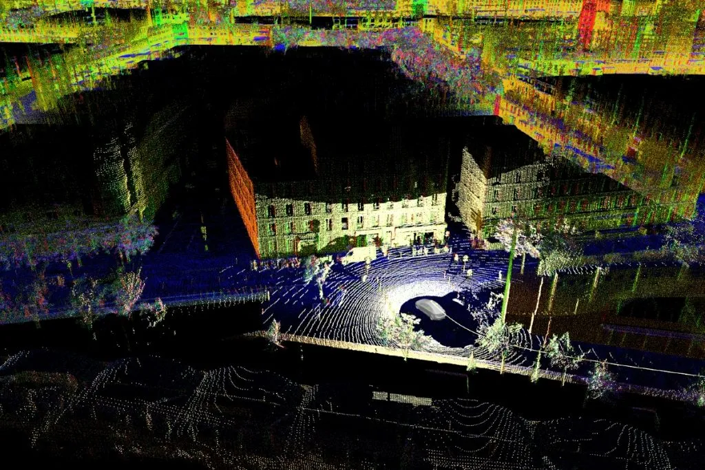 使用 Exwayz SLAM 的自主重定位示例:第一個 3D 地圖(彩色)是使用 Exwayz SLAM 算法創(chuàng)建的。當前的 LiDAR 數據(白色)正在地圖上重新定位,這就是地圖上存在完美重疊的原因。這允許計算系統(tǒng)的軌跡(白線),即系統(tǒng)在每個時刻的確切位置和方向。