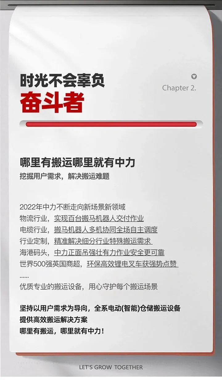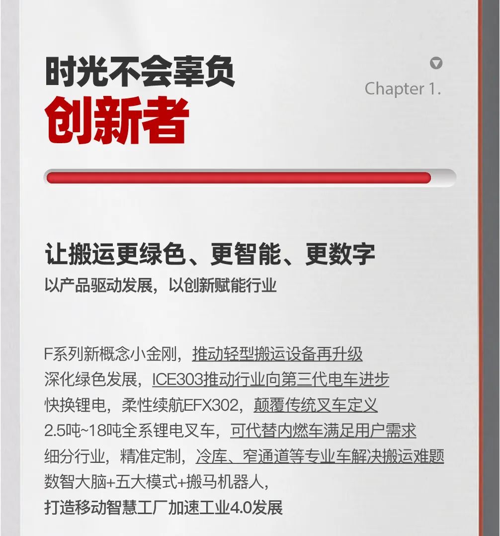 中力將以“解放人類勞動力”為使命,在實現(xiàn)從手動搬運到電動搬運的基礎(chǔ)上,正全力推動從柴油叉車到鋰電叉車的綠色革命,并且正在朝機器人搬運的方向大步前進,努力實現(xiàn)綠色搬運、智能搬運和數(shù)字搬運。