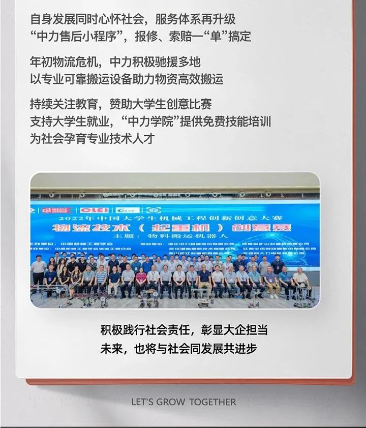 中力強調(diào)社會責(zé)任,堅持正念,致力于通過努力工作,為降低物料搬運過程中的資源消耗及空氣污染做出貢獻(xiàn)。