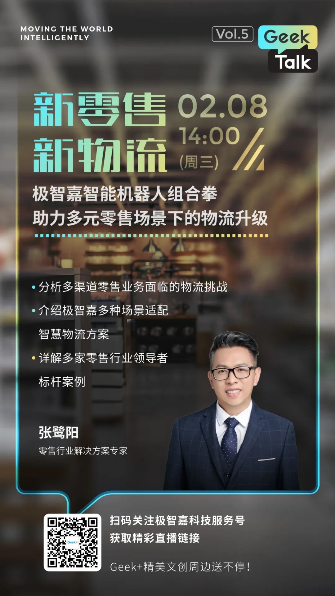 2月8日(周三)14:00,極智嘉零售行業(yè)解決方案專家張鷺陽將帶來“「新零售·新物流」極智嘉智能機(jī)器人組合拳助力多元零售場景下的物流升級(jí)”主題分享,通過對零售行業(yè)多業(yè)態(tài)場景的深入研究,為廣大零售品牌智慧物流升級(jí)提供可參考借鑒的實(shí)踐經(jīng)驗(yàn)。