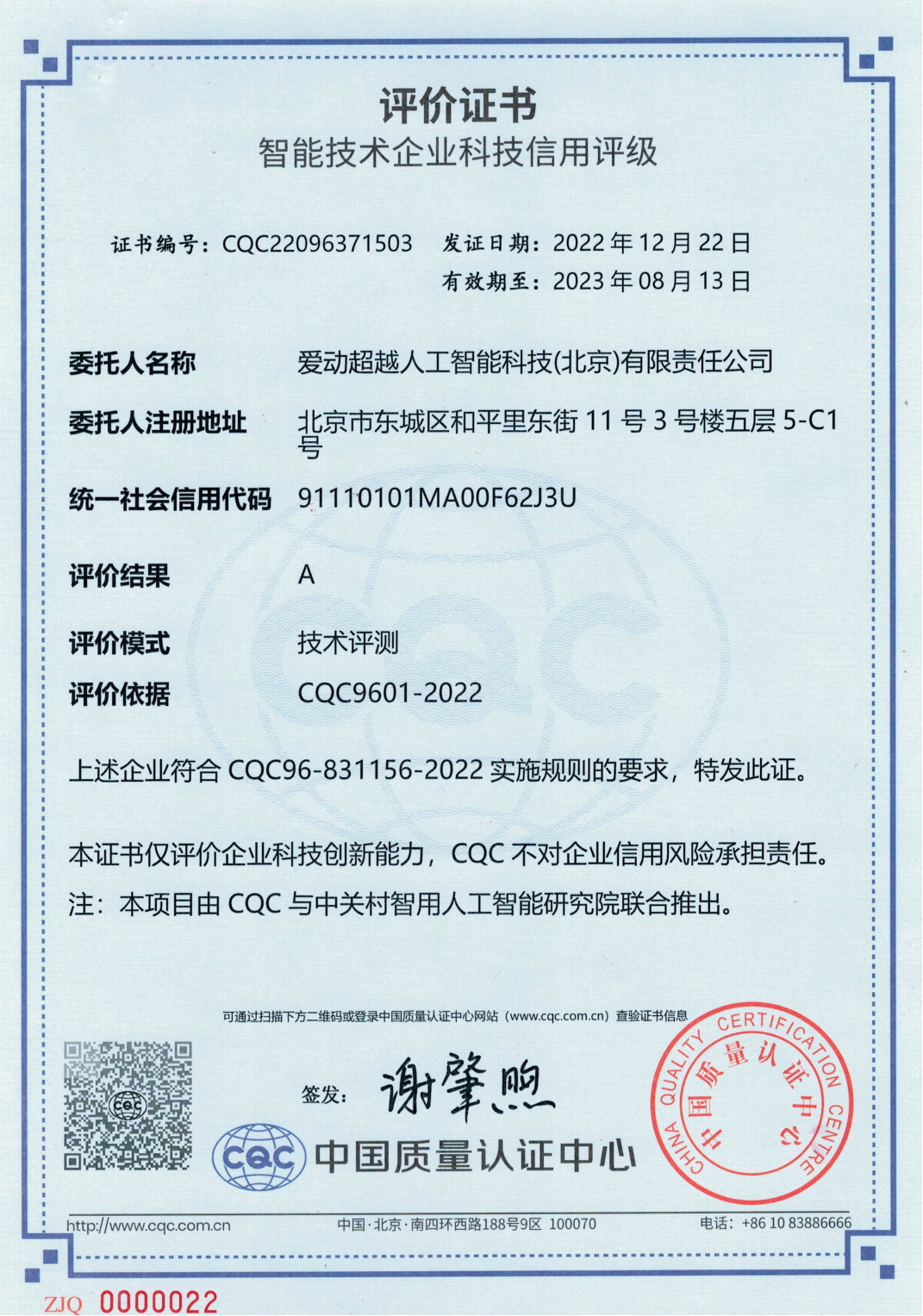 近日,愛動超越再迎喜訊,通過了由中國質(zhì)量認證中心(CQC)與中關(guān)村智用人工智能研究院聯(lián)合推出的“智能技術(shù)企業(yè)科技信用評級”評測,榮獲A級評價,并獲得了由中國質(zhì)量認證中心頒發(fā)的評價證書。