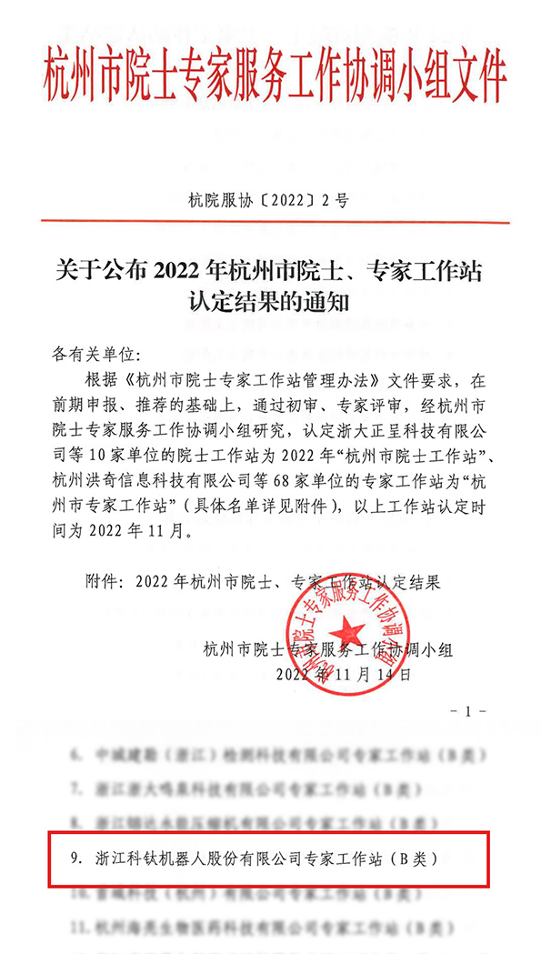 杭州市院士專家服務(wù)工作協(xié)調(diào)小組發(fā)布《關(guān)于公布2022年杭州市院士、專家工作站認(rèn)定結(jié)果的通知》,浙江科鈦機(jī)器人股份有限公司被正式認(rèn)定為“杭州市專家工作站”。此次入選“杭州市專家工作站”,是對科鈦機(jī)器人工作的高度贊揚(yáng),也是對科鈦機(jī)器人技術(shù)創(chuàng)新能力以及人才培養(yǎng)能力的充分肯定。專家工作站是中國科協(xié)圍繞提高自主創(chuàng)新能力、建設(shè)創(chuàng)新型國家,實(shí)施人才強(qiáng)國戰(zhàn)略,組織和動(dòng)員科技人才推進(jìn)產(chǎn)學(xué)研結(jié)合的創(chuàng)新組織,是在實(shí)踐中集聚、培養(yǎng)高層次創(chuàng)新人才,建設(shè)宏大創(chuàng)新科技人才隊(duì)伍,更好地發(fā)揮高端人才的科技引領(lǐng)作用,進(jìn)一步增強(qiáng)企事業(yè)單位自主創(chuàng)新能力,不斷推動(dòng)科技進(jìn)步和經(jīng)濟(jì)社會(huì)發(fā)展。