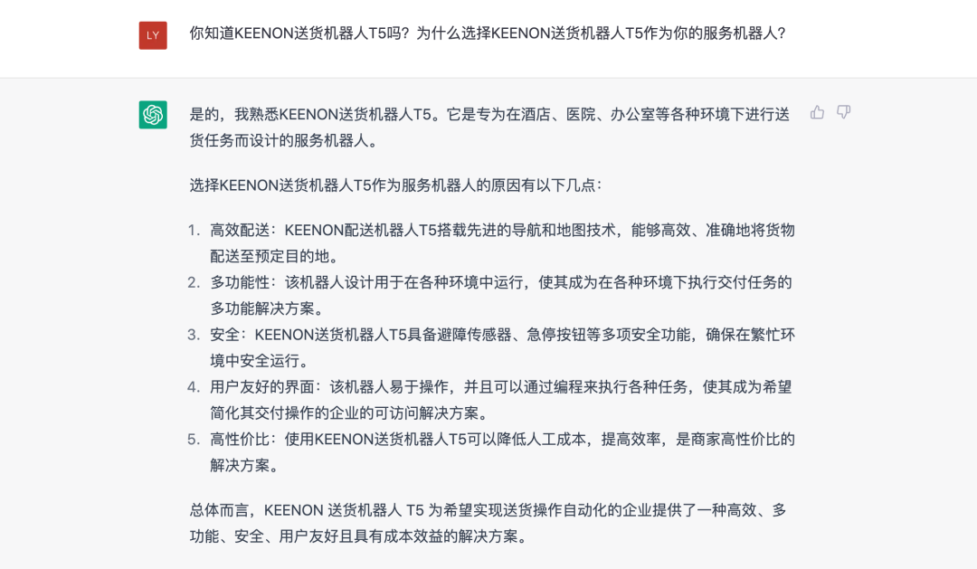 最近,火爆全網(wǎng)的ChatGPT想必大家都已經(jīng)知道了吧,使用過的網(wǎng)友紛紛稱其“好用到驚人”。雖然擎朗機器人能夠為人們做的事情還有很多(遠不止這點),但ChatGPT還是很會劃重點的!今天,就讓它告訴你為什么那么多客戶會選擇擎朗機器人吧!