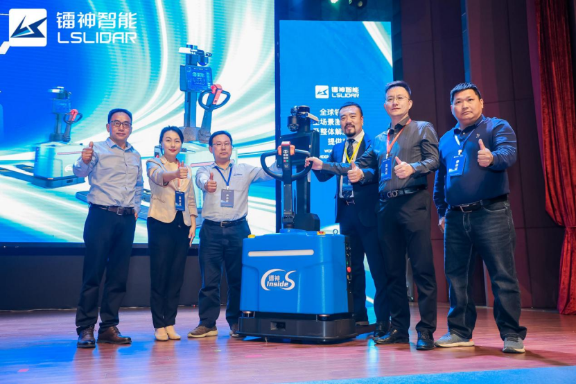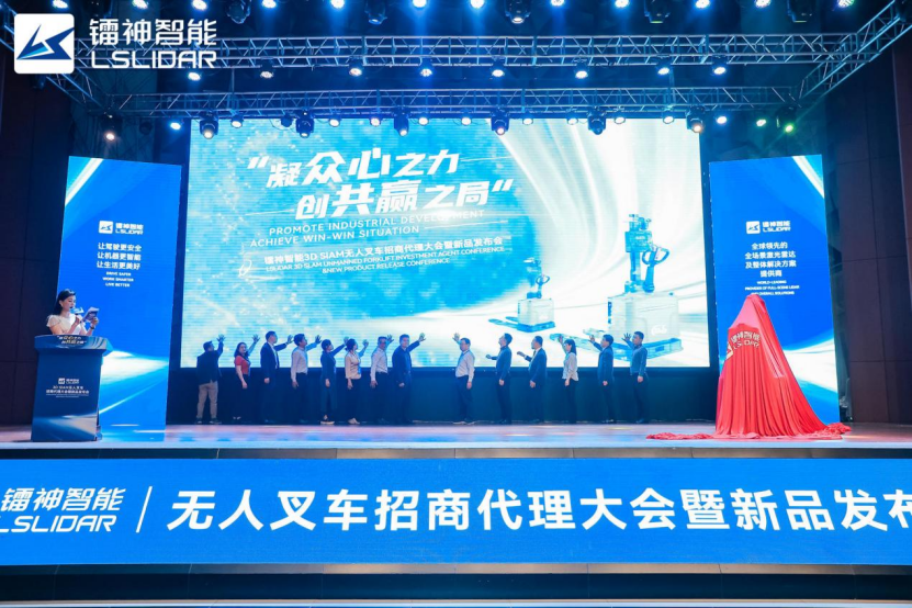 隨后,參加儀式的主要領(lǐng)導(dǎo)和嘉賓上臺(tái),帶著對(duì)鐳神智能的期許與祝福按下啟動(dòng)按鈕,共同啟動(dòng)招商代理大會(huì)暨新品發(fā)布會(huì),并共同揭幕經(jīng)典系列年度新品3D SLAM自然定位導(dǎo)航無(wú)人叉車(chē)。