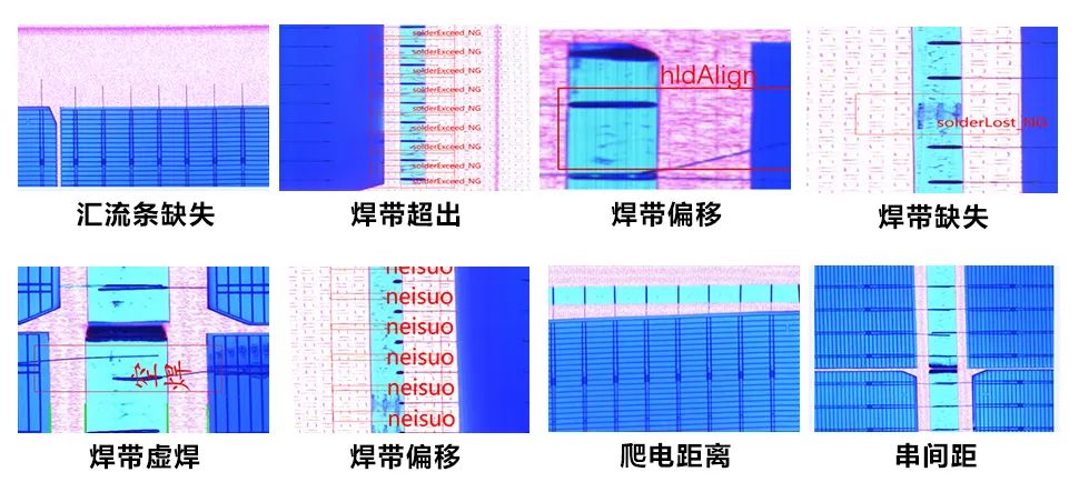 可檢測(cè)項(xiàng)達(dá)12項(xiàng),開啟/屏蔽自由選擇 ■ 本方案可對(duì)焊帶和匯流帶焊接質(zhì)量進(jìn)行檢測(cè),系統(tǒng)可穩(wěn)定檢測(cè)出各種常見的焊帶和匯流帶焊接質(zhì)量缺陷,如:焊帶超出、焊帶偏移、虛焊、內(nèi)縮、無匯流條、焊帶缺失等;■ 包含間距類檢測(cè)和判斷:爬電距離、電玻璃距離、串間距、匯流帶偏移。