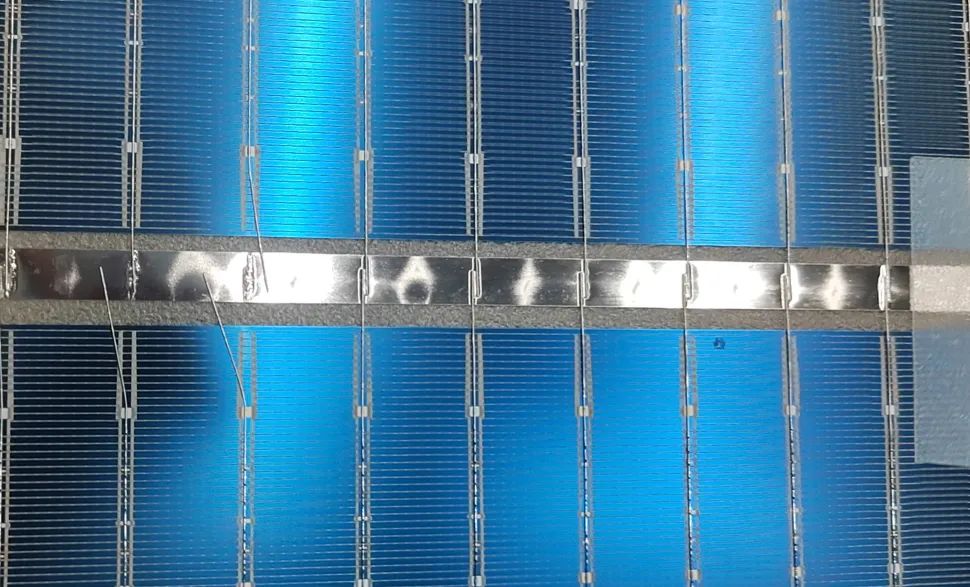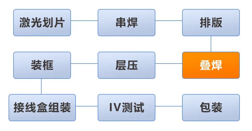 光伏組件利用光生伏特效應(yīng)將光能直接轉(zhuǎn)變?yōu)殡妬戆l(fā)電,光伏組件制備的具體工藝流程可分為:串焊→疊焊→層壓→EL 測(cè)試→裝框→裝接線盒→IV測(cè)試→成品檢驗(yàn)→包裝等,其中串焊是將太陽(yáng)能電池片通過焊帶串聯(lián)焊接,經(jīng)過電池串排版后進(jìn)入疊焊環(huán)節(jié):通過匯流帶將已經(jīng)焊接成串的電池串首末端進(jìn)行正確連接,并利用其他輔助材料進(jìn)行疊層,最終完成電池串與電池串的連接。