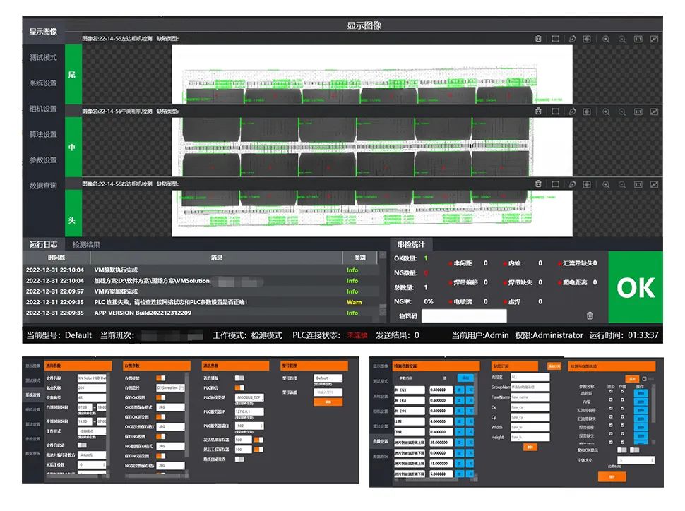 數(shù)據(jù)直觀可視化,根據(jù)需求靈活配置■ 生產(chǎn)信息、缺陷統(tǒng)計(jì)信息■ 不同組件方案配方快速切換,調(diào)試參數(shù)配置■ 存圖設(shè)置、權(quán)限管理