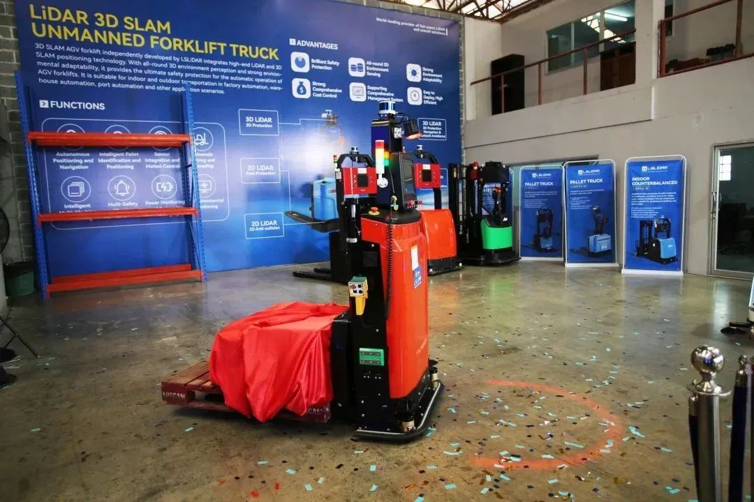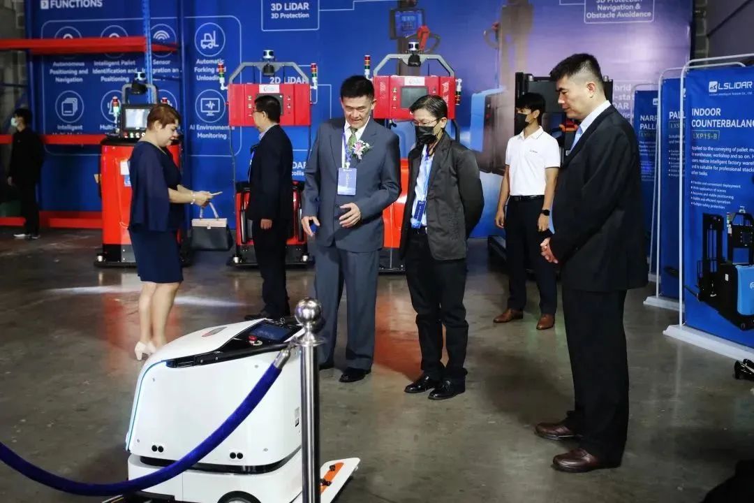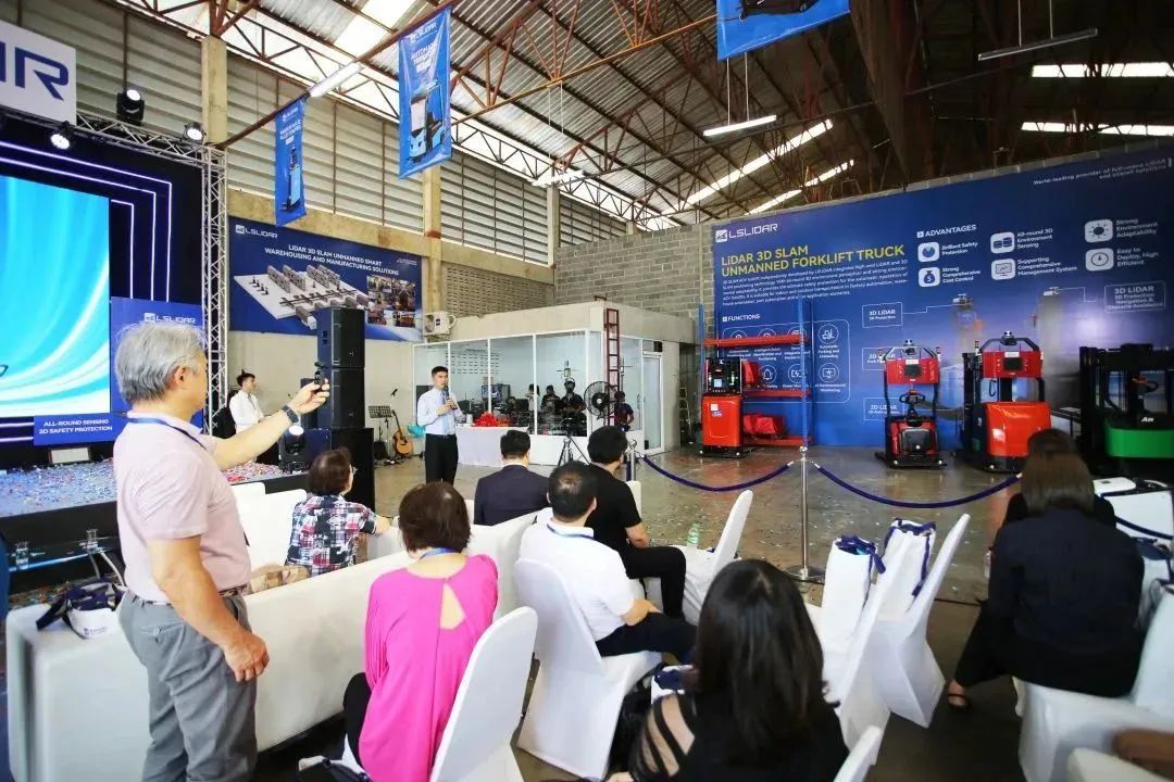 在現(xiàn)場(chǎng),為現(xiàn)場(chǎng)嘉賓更好的感受無(wú)人叉車的性能與應(yīng)用情況,同國(guó)內(nèi)一樣也布置了“動(dòng)態(tài)演示區(qū)”與“靜態(tài)展示區(qū)”,讓泰國(guó)的領(lǐng)導(dǎo)與客戶們更深切的了解鐳神智能激光雷達(dá)3D SLAM無(wú)人叉車其自然定位導(dǎo)航、全方位3D安全防護(hù)及智能搬運(yùn)能力。