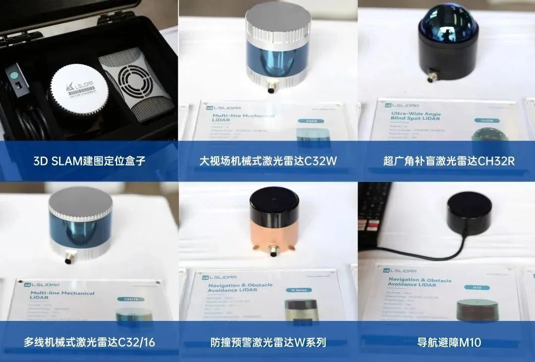 此外,激光雷達(dá)作為鐳神智能3D SLAM無(wú)人叉車重要的傳感硬件也亮相于活動(dòng)現(xiàn)場(chǎng):用于3D 立體防護(hù)的大視場(chǎng)機(jī)械式激光雷達(dá)C32W、用于3D 立體防護(hù)&定位導(dǎo)航的多線機(jī)械式激光雷達(dá)C32/16、用于2D防撞的防撞預(yù)警激光雷達(dá)W系列、用于叉尖防護(hù)的導(dǎo)航避障的M10、以及用于3D 立體防護(hù)&棧板識(shí)別的車規(guī)混合固態(tài)激光雷達(dá)CH128X1的點(diǎn)云視頻以及用于三維立體建圖的3D SLAM定位盒子。