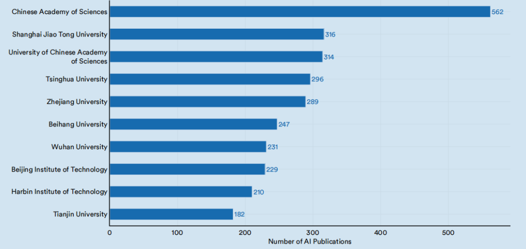 2010-21年,按各領(lǐng)域的人工智能出版物數(shù)量排名,2021年世界十大機(jī)構(gòu)