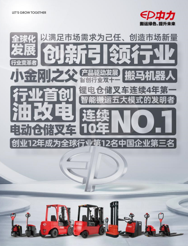 中力叉車(EP EQUIPMENT)是一家依靠產(chǎn)品創(chuàng)新而飛速成長(zhǎng)的企業(yè),專業(yè)從事電動(dòng)倉儲(chǔ)設(shè)備及叉車開發(fā)、制造、服務(wù)的全球性企業(yè)。