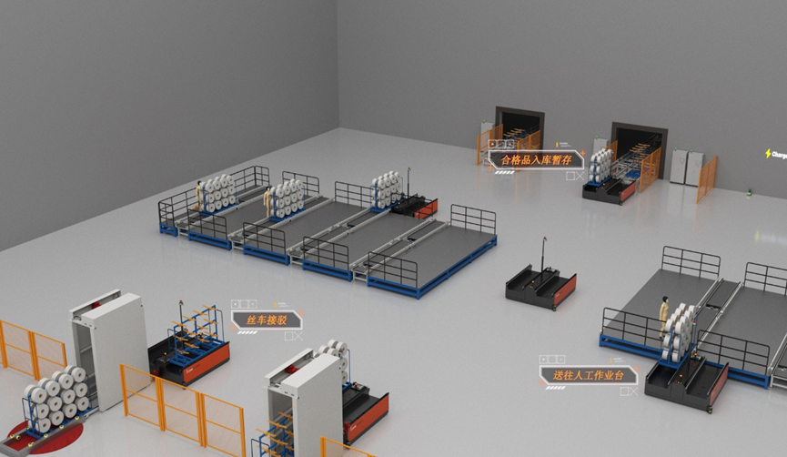 ?;徯袠I(yè)絲車后道工序無人化轉(zhuǎn)運盒子:針對?;徯袠I(yè)的絲車最后一道工序的轉(zhuǎn)運過程的多人工場景,通過獨創(chuàng)的雙工位的移動機器人實現(xiàn)長物料的無人化轉(zhuǎn)運,大大提升智能化程度。