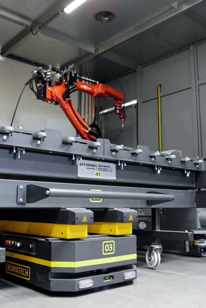 “我們就我們想到的概念與幾個方面進行了接觸。AGV 的 Kuunders 和焊接機器人的 Valk Welding 受到質(zhì)疑。雙方之前曾合作過,并愿意與我們一起制定解決方案。此外,兩家供應(yīng)商在軟件開發(fā)方面都處于領(lǐng)先地位,因此他們可以為機器人提供正確的程序以及要焊接的產(chǎn)品。我們自己負責(zé) ERP 和 TMS(Kuunders 的運輸管理系統(tǒng))之間的通信,它定義了需要焊接的位置和優(yōu)先級。Valk Welding 提供了我們可以用來創(chuàng)建焊接程序 (DTPS)、自動搜索和縮放它們 (QPT) 的軟件工具,以及車間控制軟件 (SFC)?!?/p>