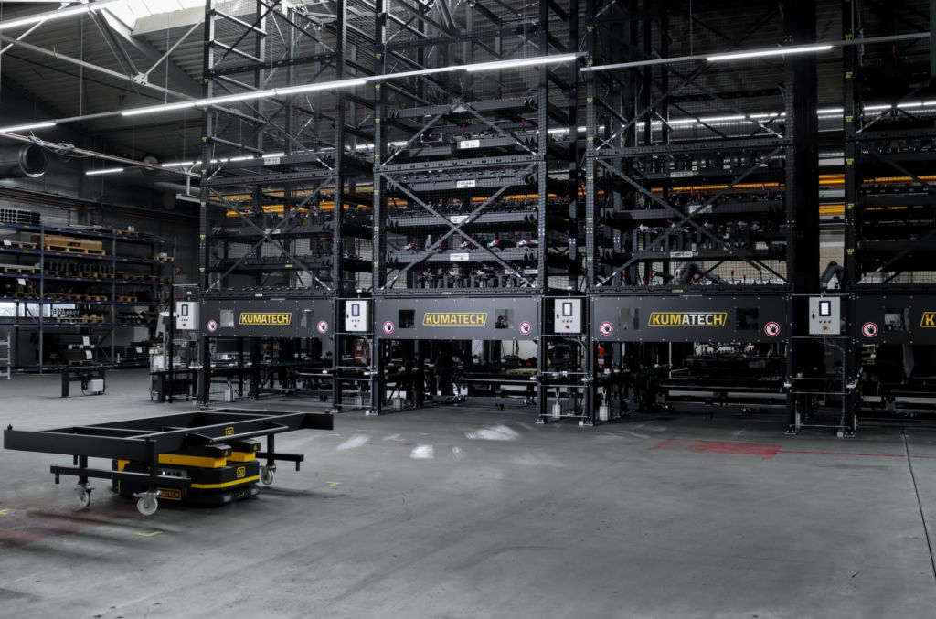 白天,零件被裝訂、拉伸并儲存在儲存塔中。AGV 全天候從塔中取出產(chǎn)品。它們配備了一個產(chǎn)品載體,并將它們驅(qū)動到可用的焊接機器人之一,并將產(chǎn)品載體與零件一起存放在工作站中。然后機器人焊接零件。當一臺 AGV 正在從焊接機器人上取下焊接好的零件時,另一臺 AGV 已經(jīng)把預(yù)焊好的零件帶到了下一張桌子上。就這樣,4臺焊接機器人和4臺AGV 24小時無人值守工作。