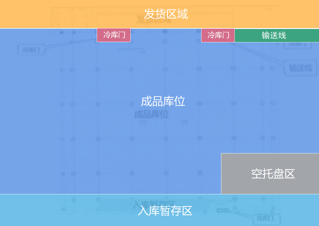項目區(qū)域包含發(fā)貨區(qū)域、成品庫位和入庫暫存區(qū),共3道冷庫進(jìn)出門,1道用于成品生產(chǎn)入庫,2道用于成品發(fā)貨出庫。