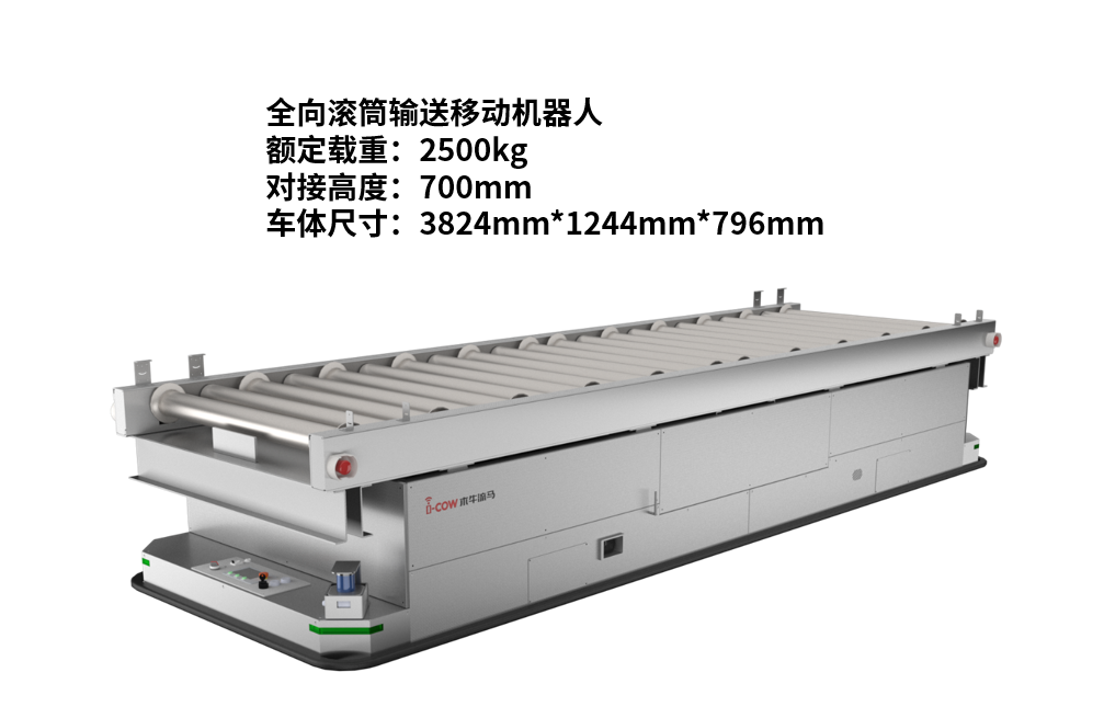 全向滾筒輸送移動機(jī)器人,雙舵輪360°全向驅(qū)動運(yùn)行,激光SLAM導(dǎo)航,直接對接輸送線,完成空滿料車上下線交換。