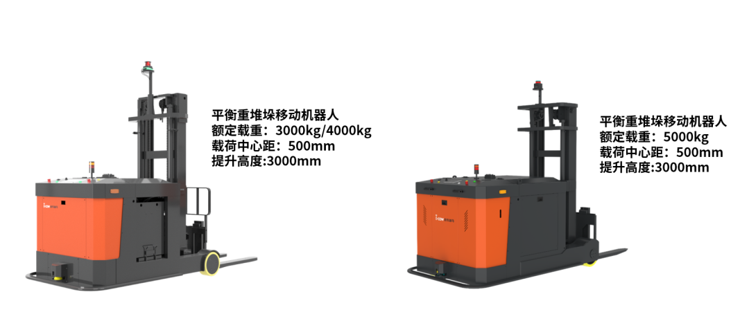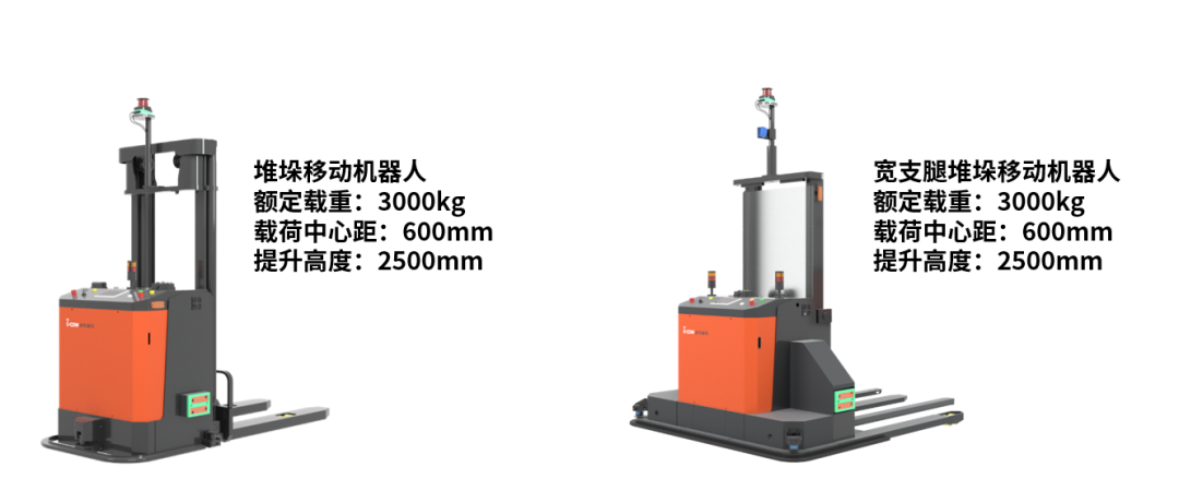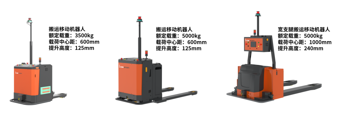 重載堆垛移動機(jī)器人,額定載重3000kg-5000kg,載荷中心距500-600mm,提升高度2500-3000mm。適用于標(biāo)準(zhǔn)托盤/封閉式托盤堆垛。根據(jù)載具或物料的不同,可選配雙托盤叉(效率倍增)、調(diào)距叉(適應(yīng)不同尺寸托盤)等滿足不同行業(yè)需求。