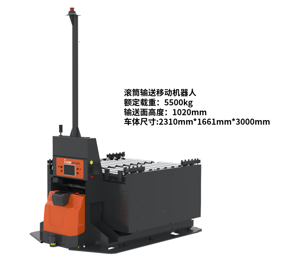 滾筒輸送移動機(jī)器人,專為金屬加工行業(yè)運(yùn)輸鋼卷特殊定制,重載滾筒,前后安全激光掃描儀,360°全包圍安全觸邊。