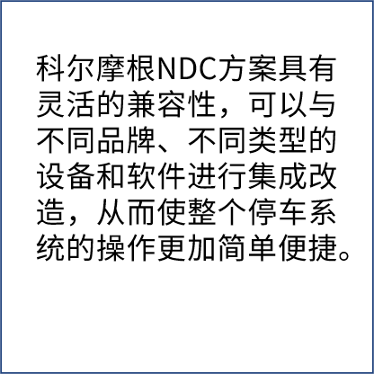 基于科爾摩根NDC系統(tǒng)集成度和智能化水平高的特點,在項目的設計上,可以為之帶來更多可能性。合作伙伴可以專注于上層應用設計,使設計更人性化。傳統(tǒng)停車場通過智能化AGV改造,可提升40%的停車空間。