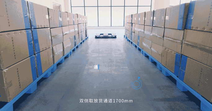 機器人尺寸與標準托盤相近,機器人原地旋轉(zhuǎn)直徑僅1.6m,通行寬度僅需1.3m,適應(yīng)窄通道場景,極大地降低了作業(yè)空間要求;取放貨通道僅需1.8m,大大提高倉庫的庫容率。