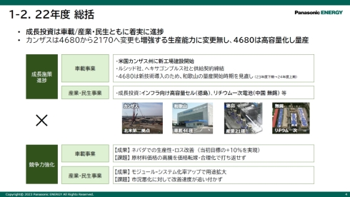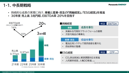 這篇公告中的業(yè)績(jī)數(shù)據(jù)并未考慮美國(guó)IRA(通脹控制)法案的影響,該法案為在其最近的業(yè)務(wù)戰(zhàn)略說明會(huì)上,松下能源設(shè)定了明確的目標(biāo)并闡明了其長(zhǎng)期戰(zhàn)略。在現(xiàn)場(chǎng),松下能源首席執(zhí)行官Issei Tadanobu解釋了公司為實(shí)現(xiàn)銷售額超過3萬億日元,EBITDA比率達(dá)到20%的目標(biāo)而做出的努力。他指出,到2030年,公司預(yù)計(jì)汽車電池工廠的產(chǎn)能將翻兩番,達(dá)到200GWh,而電芯的能量密度也將提升25%,達(dá)到1kWh/l。