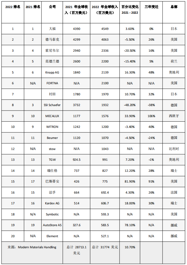 大福(Daifuku)仍以454億美元的年銷售額位居榜單第一,高于2021年的439億美元收入。大福將其持續(xù)增長歸功于上一年的大量訂單積壓、對半導(dǎo)體制造商的強(qiáng)勁銷售、零售系統(tǒng)的擴(kuò)展和電子商務(wù)部門,并提高了服務(wù)收入。 Dematic作為屬于德國凱傲集團(tuán)(KION Group)的供應(yīng)鏈解決方案部門,仍排名第二,其收入低于去年。其2022財(cái)年供應(yīng)鏈解決方案部門的收入從歐元轉(zhuǎn)換為406億美元,低于上一年的429億美元(2021財(cái)年)。 Covid-19推動(dòng)了市場歷史性的投資,我們認(rèn)為這是不可持續(xù)的。在此期間,德馬泰克(Dematic)的增長高于市場。今年,我們面臨著外部和內(nèi)部的挑戰(zhàn),因?yàn)槿虻鼐壵魏秃暧^經(jīng)濟(jì)發(fā)展加速了我們供應(yīng)鏈的波動(dòng),導(dǎo)致我們的材料、能源和物流成本急劇上漲。盡管存在這種波動(dòng),但我們?nèi)詫W⒂跒榭蛻籼峁┓?wù),投資于我們的員工和戰(zhàn)略計(jì)劃?!? Dematic總裁兼KION執(zhí)行董事會(huì)成員Hasan Dandashly表示。 Honeywell Intelligrated排名第三,其2022年收入為23.3億美元,低于2021年的29.4億美元,但仍有上升趨勢。霍尼韋爾(Honeywell)的領(lǐng)導(dǎo)層認(rèn)為自動(dòng)化解決方案具有長期增長潛力。 霍尼韋爾安全與生產(chǎn)力解決方案總裁兼首席執(zhí)行官George Koutsaftes表示:“近年來,全球供應(yīng)鏈被迫適應(yīng)了劇變,”他說。“大流行病和在線購物的迅速崛起給電子商務(wù)基礎(chǔ)設(shè)施和物流帶來了巨大壓力。如今,各行各業(yè)都在轉(zhuǎn)向自動(dòng)化和數(shù)字化,以建立更安全、更高效的運(yùn)營,提高應(yīng)對需求快速變化的能力?!?/span> KNAPP在又一個(gè)強(qiáng)勁的增長年中排名第五,2022年的收入為21.3億美元,高于18.4億美元。KNAPP北美營銷副總裁Kevin Reader表示,KNAPP在醫(yī)療保健、零售、食品、時(shí)尚、倉儲(chǔ)和制造等所有主要領(lǐng)域都取得了增長。 Reader補(bǔ)充說,KNAPP在當(dāng)年投資近7000萬美元用于研發(fā),持續(xù)改進(jìn)其解決方案,如可在六個(gè)月內(nèi)部署的穿梭系統(tǒng)、名為Zero Touch的全自動(dòng)袖珍系統(tǒng),以及名為KiSoft Genomix的自動(dòng)化主數(shù)據(jù)平臺(tái),用于掃描和管理自動(dòng)化部署所需的數(shù)據(jù)。 FORTNA排名第六,其收入達(dá)21億美元,從某種意義上說,是我們榜單上的新成員。在2022年4月,MHS Global(去年在我們的前20強(qiáng)中排名第8)與領(lǐng)先的系統(tǒng)集成商、軟件和解決方案提供商Fortna合并,共同成立了FORTNA。MHS和FORTNA都是Thomas H. Lee Partners投資組合的一部分,Thomas H. Lee Partners仍然是合并后公司的主要股東。 去年11月,該公司宣布MHS和FORTNA將合并為一家名為FORTNA的公司。FORTNA的首席執(zhí)行官Rob McKeel在當(dāng)時(shí)解釋說,利用市場對FORTNA名稱的認(rèn)可是有意義的?!拔覀冞x擇FORTNA這個(gè)名字,不僅是因?yàn)檫@個(gè)名字在市場上已經(jīng)享有很高的聲譽(yù),而且還因?yàn)樗N(yùn)含的力量和韌性,”他說。 排名第七的是Murata Machinery,其2022年收入為19.7億美元,高于17.8億美元。Murata董事總經(jīng)理Takenori Yanai評論說,這一增長得益于半導(dǎo)體行業(yè)以及醫(yī)藥批發(fā)和零售行業(yè)對倉庫自動(dòng)化的需求不斷增加,尤其是在Covid-19期間加速增長。他指出,組件短缺、運(yùn)費(fèi)上漲和美元價(jià)值對業(yè)務(wù)產(chǎn)生了一些負(fù)面影響。 位列第八的是SSI SCHAEFER Group,該公司報(bào)告2022財(cái)年的收入為181億歐元,即19.3億美元。根據(jù)公司新聞稿,2022財(cái)年的重點(diǎn)是加強(qiáng)集團(tuán)的創(chuàng)新能力。該集團(tuán)最近還簽署了收購移動(dòng)機(jī)器人供應(yīng)商DS Automotion GmbH的協(xié)議。 排名第九的是MECALUX,報(bào)告的收入為15.7億美元,高于11.7億美元。作為全球供應(yīng)商,MECALUX以其存儲(chǔ)解決方案聞名,并提供倉庫管理軟件。 WITRON Integrated Logistics排名第十,2022年收入為12億美元,低于2021年12.4億美元的收入。該公司將其業(yè)績歸功于食品零售行業(yè)在干貨、新鮮和冷凍產(chǎn)品領(lǐng)域的持續(xù)實(shí)力。 在我們名單的后半部分可以看到一些變動(dòng),包括一些新進(jìn)入者的顯著收入使一些知名供應(yīng)商落后。 伯曼集團(tuán)排名第11,其2022年收入為10.7億美元,略低于11.2億美元。2022年5月,該集團(tuán)收購了FAM GmbH,擴(kuò)大了伯曼在礦物和采礦部門的產(chǎn)品組合。 排名第12的是stow Robotics,收入為10.4億美元。該公司的產(chǎn)品包括單位負(fù)載自主移動(dòng)機(jī)器人(AMR)、貨架、自動(dòng)托盤穿梭車、半自動(dòng)托盤穿梭車和垃圾箱/手提袋穿梭車。去年5月,stow收購了巴黎的AMR供應(yīng)商iFollow SAS的多數(shù)股權(quán)。 排名第13的是TGW Logistics,收入為9.91億美元,高于9.245億美元,保住了第13名。 Swisslog排名第14,總收入為8.27億美元,高于7.37億美元。Swisslog首席執(zhí)行官Antonio Trioschi表示,盡管整個(gè)行業(yè)面臨經(jīng)濟(jì)和供應(yīng)鏈方面的挑戰(zhàn),但Swisslog在這一年取得了強(qiáng)勁的業(yè)績,超過了其三個(gè)主要財(cái)務(wù)KPI,并創(chuàng)造了訂單積壓的記錄。 “我們改進(jìn)了進(jìn)入市場的方式,加強(qiáng)了我們在戰(zhàn)略市場的地位,特別是在電子商務(wù)領(lǐng)域。