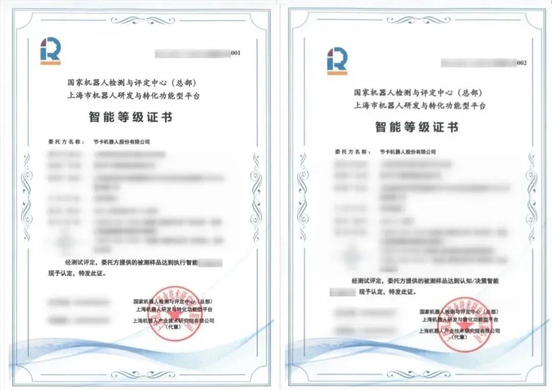 上海市經(jīng)濟(jì)和信息化委員會(huì)智能制造推進(jìn)處副處長吳春平女士,上海交通大學(xué)元知機(jī)器人研究院院長朱向陽教授、副院長盛鑫軍教授見證了本次頒證儀式。上海電器科學(xué)研究所(集團(tuán))有限公司副總裁、研究院董事長鄭軍奇先生,研究院院長黃慧潔女士分別向節(jié)卡機(jī)器人頒發(fā)了智能機(jī)器人分級執(zhí)行智能證書和認(rèn)知/決策智能證書。
