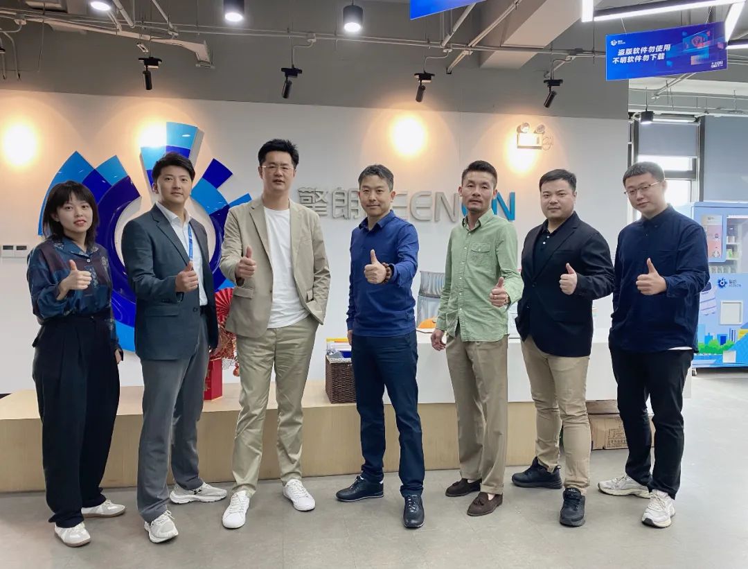 擎朗智能合伙人兼高級副總裁郝林(左三)、偉仕佳杰智能數(shù)碼業(yè)務(wù)群副總裁李新強(qiáng)(右四)、市場營銷總監(jiān)白云飛(右三)、產(chǎn)品總監(jiān)劉曉龍(右二)