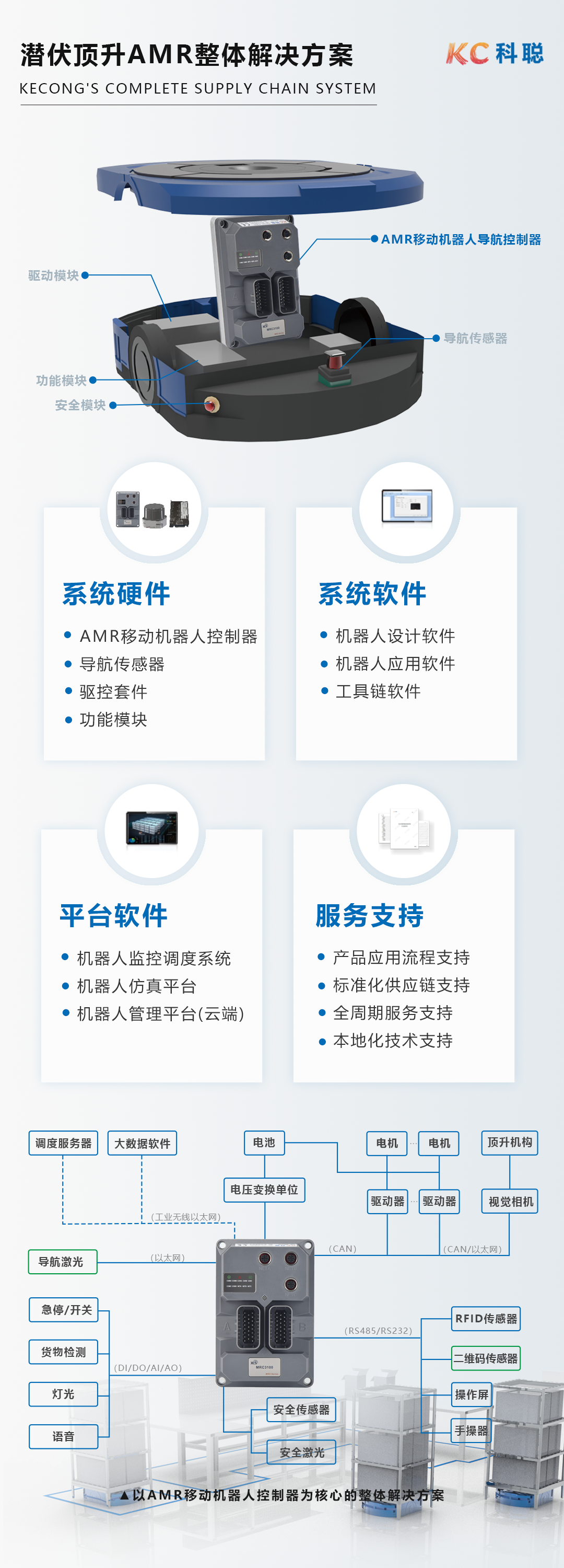 高品質(zhì)和高性價比的AMR移動機(jī)器人控制器背后,沉淀了科聰多年來對各種AMR整體解決方案的積累。選擇科聰AMR移動機(jī)器人控制器,可以快速、靈活地幫助用戶去適配一臺潛伏頂升AMR 所需要的各種導(dǎo)航傳感器、驅(qū)動模塊、安全模塊和其它功能模塊。同時科聰完整的供應(yīng)鏈體系,可以根據(jù)客戶需求,快速完成車輛配置設(shè)計和選型清單。