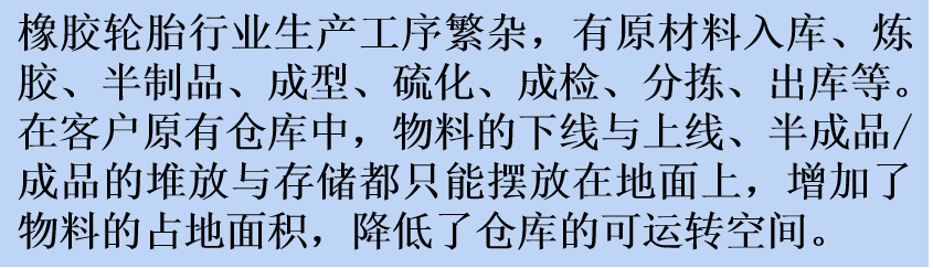 此次服務(wù)的客戶為綜合實(shí)力全國領(lǐng)先的橡膠輪胎企業(yè),存在生產(chǎn)工藝工序復(fù)雜、存儲空間有限、搬運(yùn)效率較低的痛點(diǎn)。