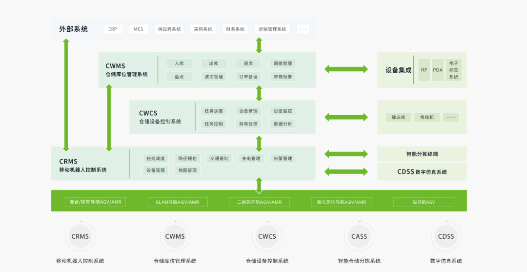 佳順智能機器人軟件平臺由CRMS移動機器人控制系統(tǒng)、CWMS倉儲庫位管理系統(tǒng)、CWCS倉儲設(shè)備控制系統(tǒng)、CASS智能倉儲分揀系統(tǒng)和CDSS數(shù)字仿真系統(tǒng)為核心組成。通過CWMS可以低成本實現(xiàn)倉儲管理智能化,CWCS系統(tǒng)可以實現(xiàn)對各類自動化物流設(shè)備的管控,CRMS系統(tǒng)向上可與企業(yè)上層系統(tǒng)對接,向下控制移動機器人實現(xiàn)高效搬運,通過CDSS可在設(shè)計規(guī)劃階段發(fā)現(xiàn)潛在問題,保證項目高效交付。幾大系統(tǒng)協(xié)同作業(yè),為客戶交付高質(zhì)量的數(shù)字化物流產(chǎn)品。