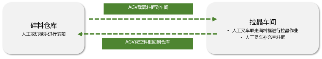 硅料倉庫通過機械手或人工裝箱后,通過移動機器人搬運料框到拉晶車間內(nèi)。
