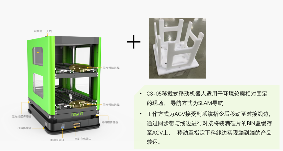 佳順智能機器人主要解決了硅片的高頻次搬運作業(yè),從發(fā)料機通過移動機器人,自動搬運料滿BIN盒至制絨工序自動線邊。