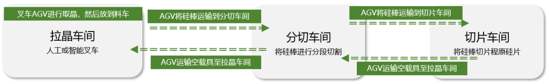 從拉晶車間,用智能叉車完成取晶,然后通過移動機器人搬運硅棒到分段或者切片車間內(nèi)。