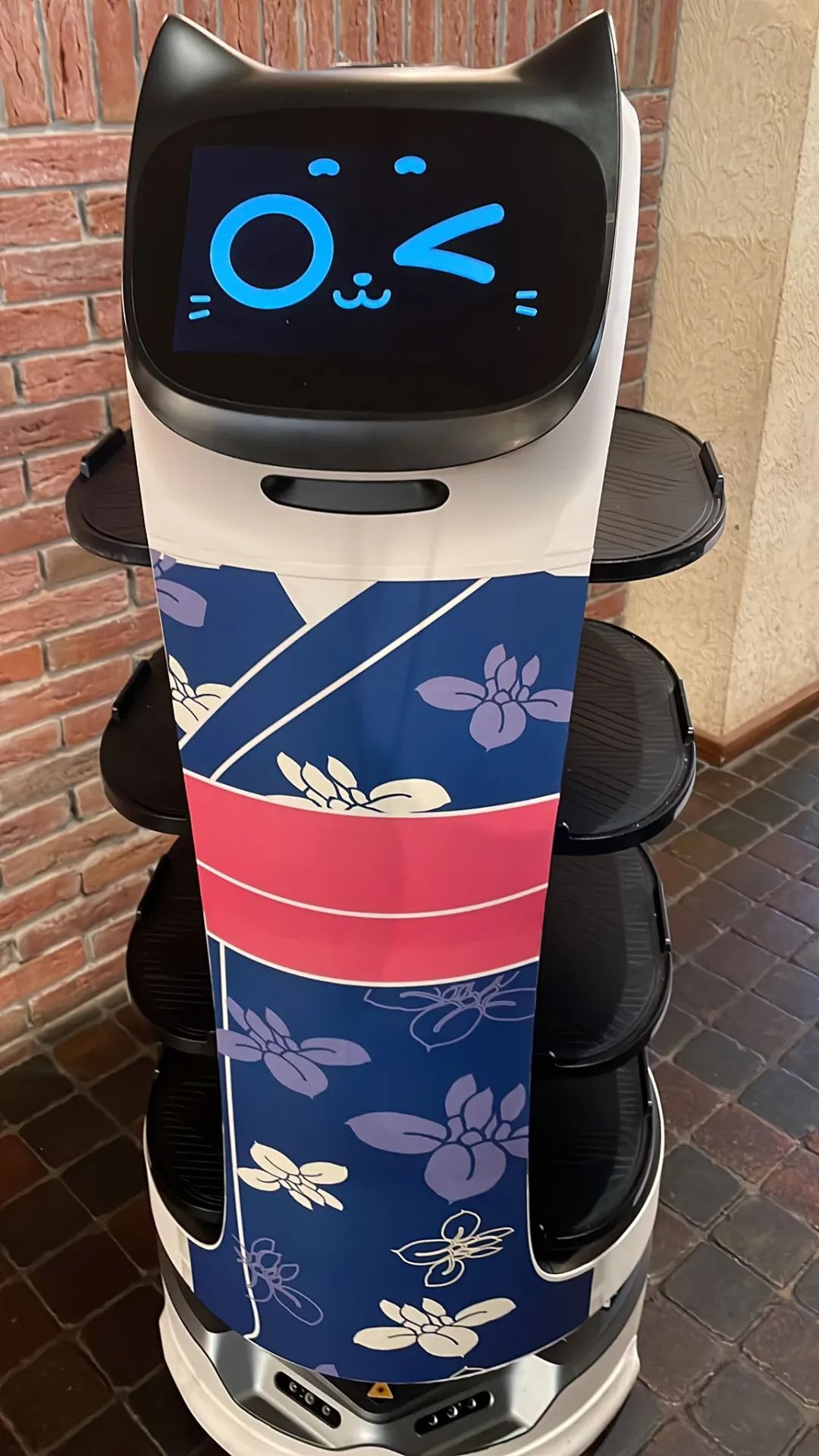 例如日本市場偏好可愛款式的機器人,“貝拉”恰好符合這一需求?!柏惱睓C器人的頭部設計為一對“貓耳朵”,通過觸摸可以反饋多種表情,顧客常常會通過觸摸耳朵與機器人互動。在生日模式下,“貝拉”還可以為顧客演奏生日歌,搭配萌趣的表情讓情感氛圍表達更加生動。為了進一步迎合日本市場,普渡科技還為“貝拉”設計了櫻花、和服等多樣周邊商品,深受當?shù)貧g迎。