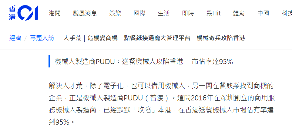 據(jù)香港最大綜合媒體《香港01》報道,為了解決用工荒,普渡機器人已經(jīng)默默“攻陷”香港,在香港送餐機器人市場占有率達到95%!在港人熟悉的餐廳中,都能見到普渡機器人送餐的身影,包括大家樂、大快活、但馬屋、牛角、美心集團旗下餐廳、海港酒家、明星酒樓、海底撈等。