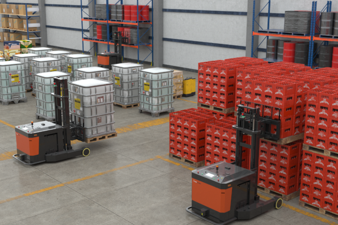 ? 多臺(tái)重載堆垛移動(dòng)機(jī)器人自動(dòng)對(duì)接輸送線完成物料配送