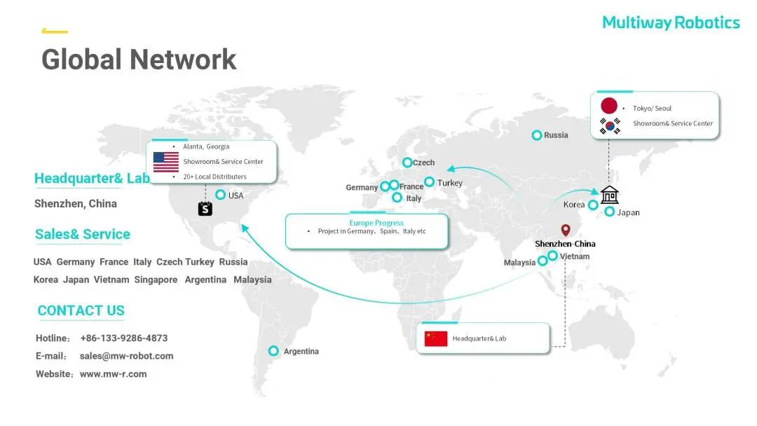 勱微機(jī)器人(Multiway Robotics)是一家領(lǐng)先的場內(nèi)智能物流解決方案提供商。總部位于中國深圳,在華中、華東、西南、東北等地均設(shè)有辦事處,并且成立了海外運(yùn)營中心,業(yè)務(wù)銷售、運(yùn)營和服務(wù)覆蓋國內(nèi)外各地區(qū)。