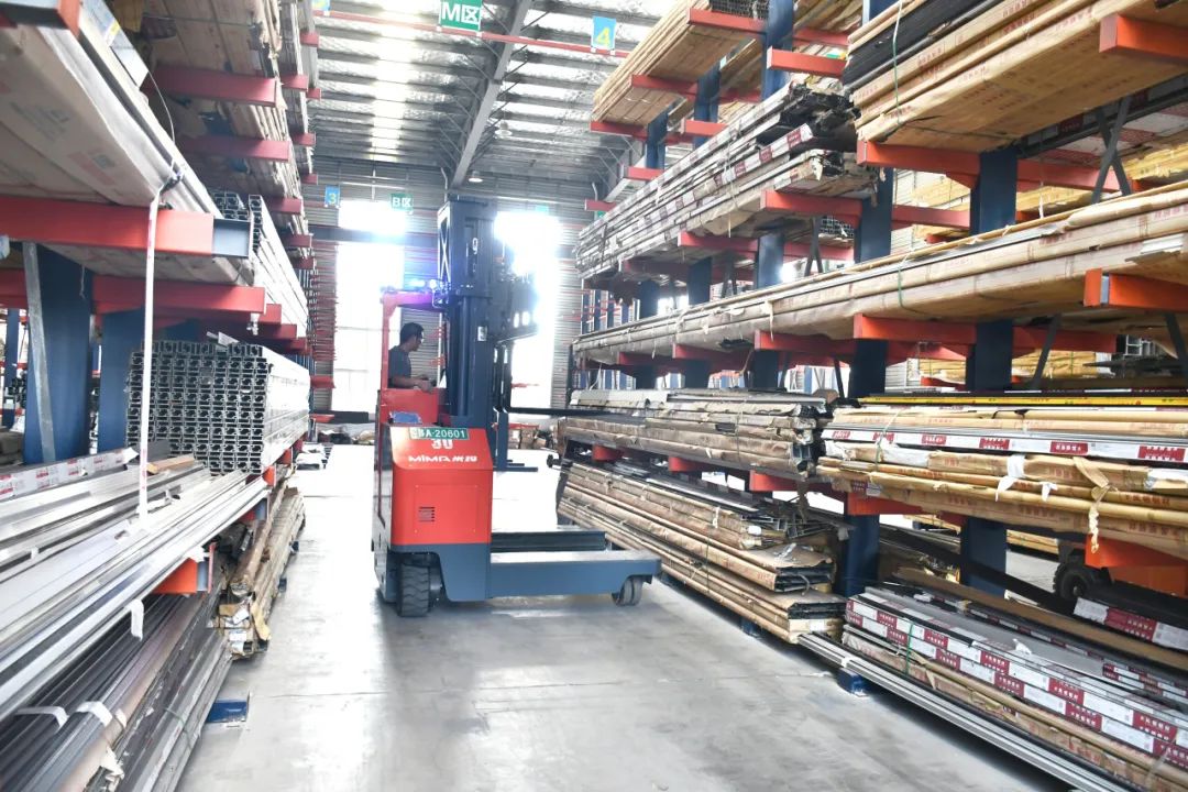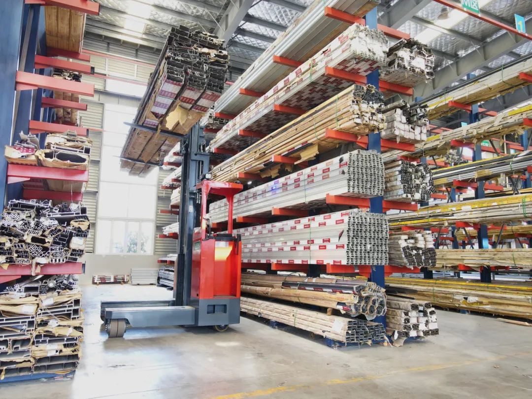 1、倉庫為懸臂式貨架密集倉儲,通道距離窄,存放物料主要為長物料鈦合金建材,搬運難度高;