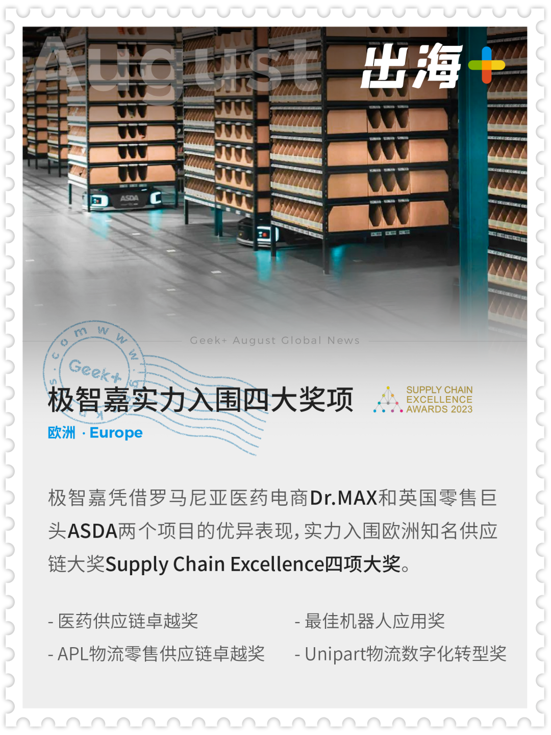 憑借著與羅馬尼亞醫(yī)藥電商Dr.MAX和英國零售巨頭ASDA合作標桿項目出色的落地價值,極智嘉入選2023 Supply Chain Excellence四項大獎。