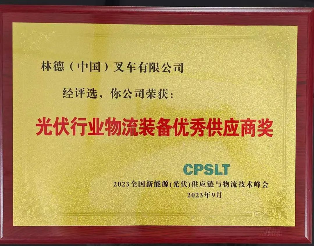 在會議上,林德憑借強大的產(chǎn)品實力以及光伏行業(yè)創(chuàng)新實踐案例,獲得行業(yè)專家及用戶的肯定,被授予為“2023全國光伏行業(yè)物流裝備優(yōu)秀供應(yīng)商獎”。