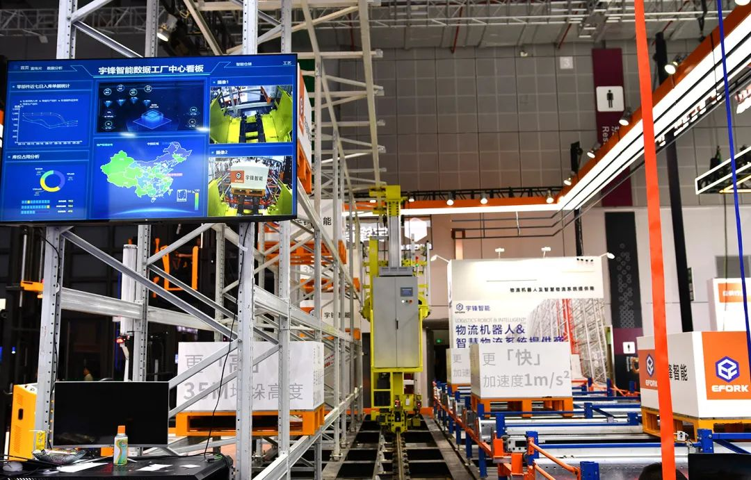 宇鋒智能通過各存儲設(shè)備特性進(jìn)行柔性化組合,使用四向穿梭車進(jìn)行高密集存儲,將存儲區(qū)的空間利用達(dá)到最大化。同時,由于提升機(jī)和庫內(nèi)上下架策略的限制,四向穿梭車無法滿足的效率問題由線邊堆垛機(jī)補(bǔ)充。四向穿梭車出庫通過揀選環(huán)節(jié),將配送中心所需貨物通過線邊堆垛機(jī)進(jìn)行輸送存儲。存儲貨物均為滿托配送,與四向車庫形成播種墻式存儲。此次展出的為雙立柱輕型鋁合金堆垛機(jī),雙驅(qū)動結(jié)構(gòu),能夠同時滿足高精度和高效能的應(yīng)用場景。