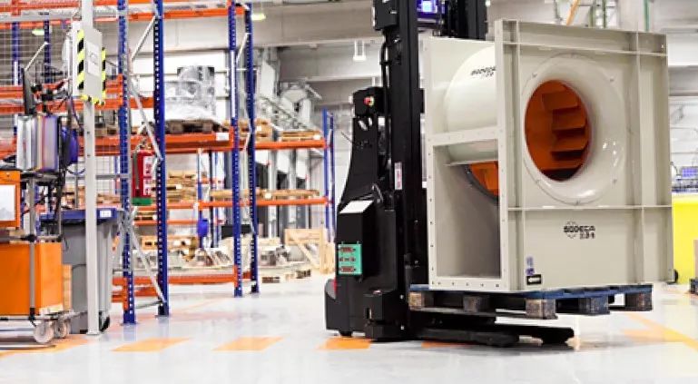 位于西班牙的Sodeca是一家專業(yè)的工業(yè)風(fēng)機(jī)制造商。為了解決人力搬運(yùn)大型風(fēng)機(jī)與物料的隱患與成本,并簡化工廠內(nèi)運(yùn)輸流程,Sodeca引入了兩臺(tái)激光導(dǎo)航下的ABB堆垛式AMR,全自動(dòng)化完成產(chǎn)品入庫、生產(chǎn)線進(jìn)料和成品運(yùn)輸至集貨區(qū)等流程。