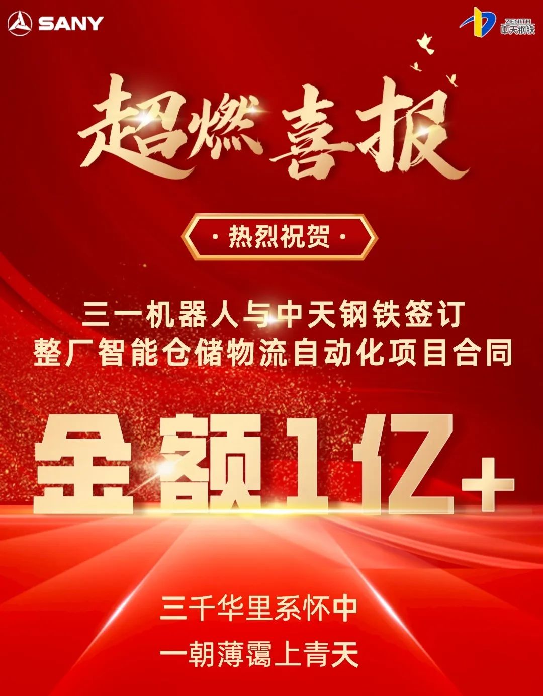 10月31日,三一機器人科技有限公司與中天鋼鐵集團(淮安)新材料有限公司在長沙簽訂超高強精品鋼簾線整廠智能倉儲物流自動化項目合同,合同總金額超1億元人民幣。