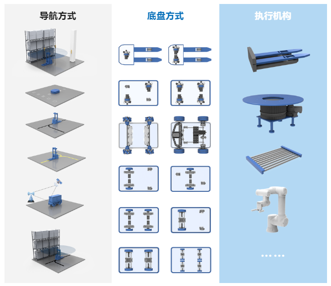 多種導(dǎo)航方式、多種底盤方式和執(zhí)行機(jī)構(gòu)任意組合,快速定義所需構(gòu)建的移動(dòng)機(jī)器人類型。