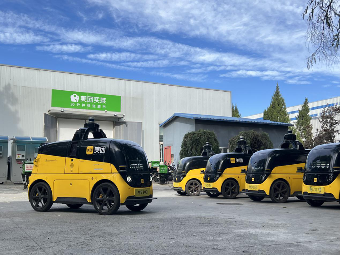 美團(tuán)買菜后沙峪站點(diǎn),美團(tuán)自動(dòng)配送車整裝待發(fā)。