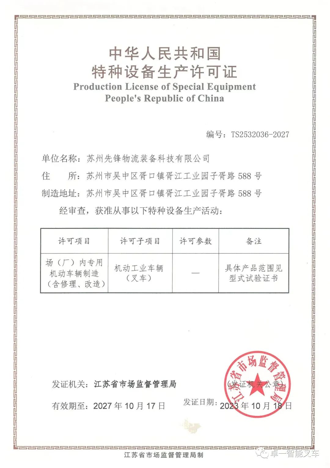 近日,經(jīng)江蘇省市場監(jiān)督管理局審核批準,卓一智能叉車順利通過新一次“特種設(shè)備生產(chǎn)許可證”換證評審。